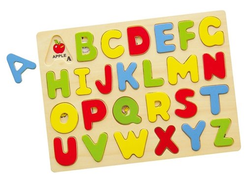 Dřevěná barevná vkládačka bez úchytek pro děti pro první seznamování s písmenky. Jednotlivé dílky (písmena) se umisťují do vyfrézovaných obrysů na dřevěnou desku. Pod písmenky se ukrývá obrázek s anglickým názvem. Rozměr složeného puzzle cca 30 x 23 cm
