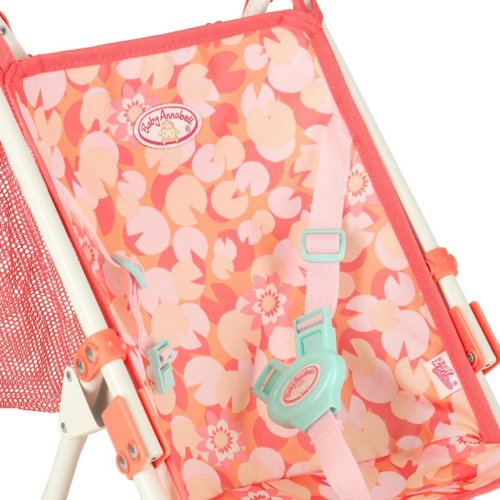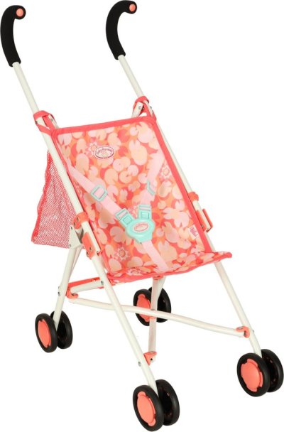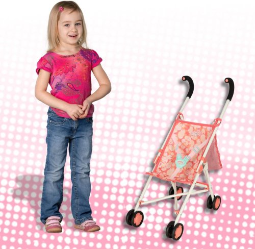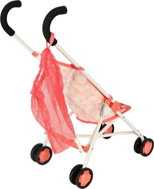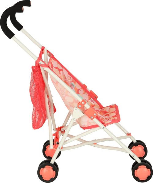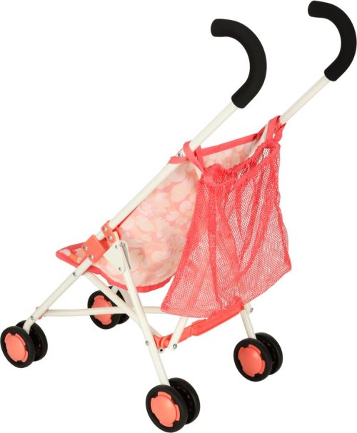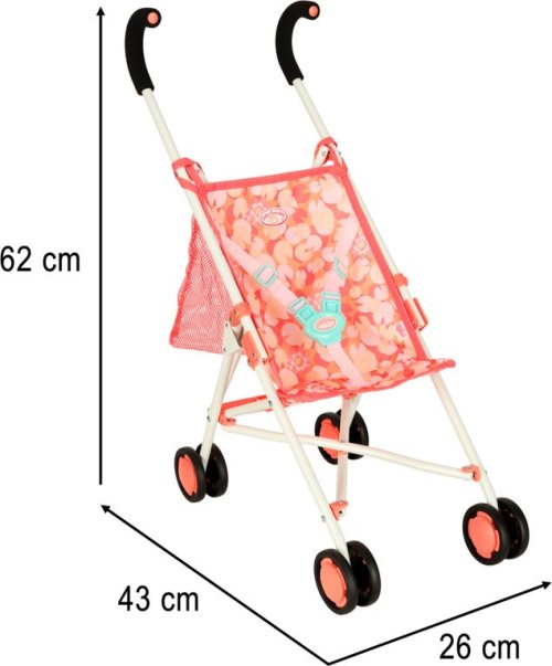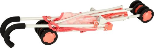 Materiál: kov, polyester, plast (kolečka), Barva: růžová, Rozměry v rozloženém stavu: 26 cm x 43 cm x 62 cm, Rozměry ve složeném stavu: 72 cm x 11 cm x 9 cm, Průměr koleček: 7 cm, Pro panenky o velikosti 34-46 cm.