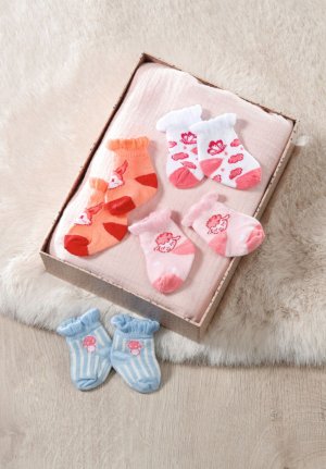 Učit se chodit v měkkých botičkách, vznášet se v pokojíčku jako motýlek, vesele skákat jako veverka nebo prostě vypadat rozkošně jako třeba muchomůrka... To všechno zvládne Baby Annabell ve svých ponožkách. Růžové ponožky jsou ozdobeny bílými puntíky a ovečkou, kterou Baby Annabell miluje. Na bílých ponožkách poletuje motýlek mezi růžovými obláčky. Ponožky s modrými a bílými proužky zdobí roztomilá muchomůrka. Z oranžových ponožek zvědavě vykukuje ušatá veverka.