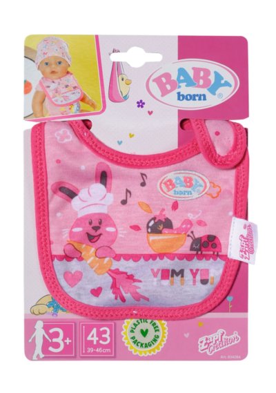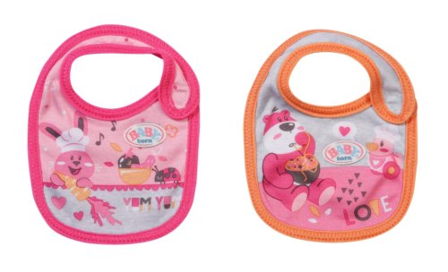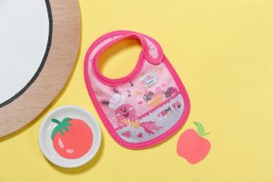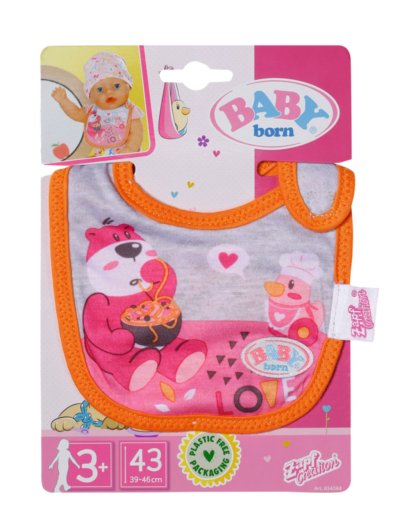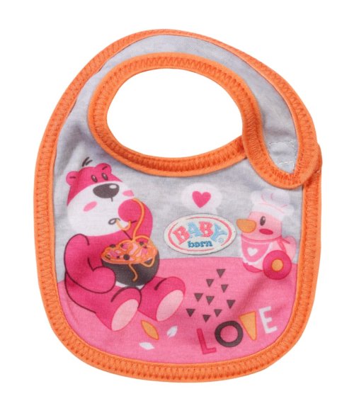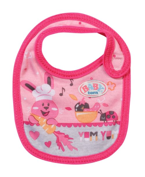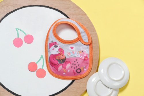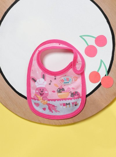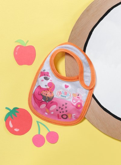 Tady se někdo pocintal. Jakmile BABY born pije mléko nebo jí kašičku, vždy se něco rozlije. Čím více si jídlo užívá, tím víc se pobryndá. Proto má malý jedlík připraveny dva náhradní bryndáčky. Na růžovém bryndáčku je obrázek zajíčka Benna v kuchyni. Zná ty nejlepší recepty na přípravu mrkvičky. Na oranžovém bryndáčku spokojeně hoduje medvídek Bruno. Chutnají mu ale pouze špagety, které připraví kačenka Berta.