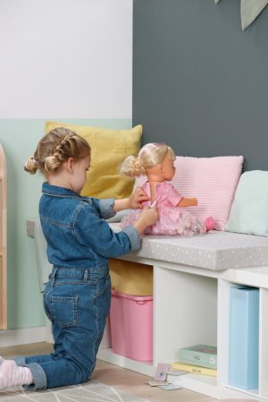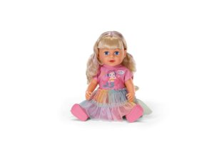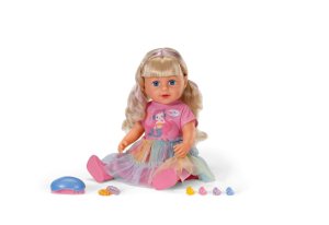 BABY born Carla má krásné, vysoce kvalitní vlásky a součástí je 7 doplňků na česání. • Zábava při česání: Dlouhé kvalitní vlásky z nylonu se skvěle češou. • Se 7 doplňky: Carla má 1 kartáč, 2 gumičky a 4 sponky do vlasů. • Skvělá pohyblivost: Hýbe rukama, otáčí hlavou a má ohebné kolenní klouby. • Dokáže sama stát: Carla umí stát sama bez opory. • Nový outfit: Roztomilé tričko, barevná tylová sukně a stylové boty. • Může se koupat: Díky pevnému tělíčku ji můžete vzít i do vany.