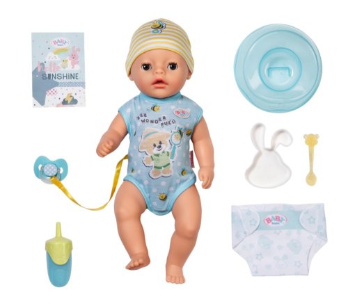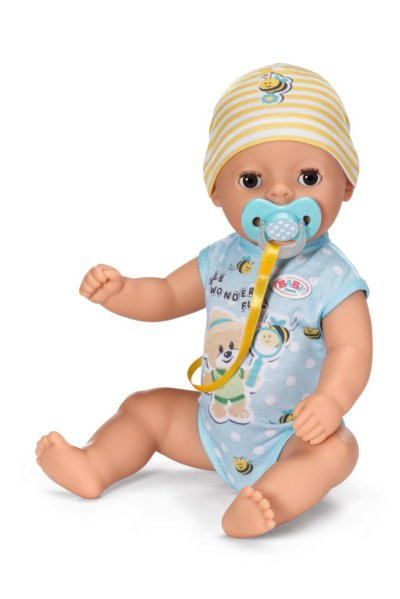 BABY born Little, chlapeček, má 7 skvělých funkcí, které fungují bez baterií. Je dodáván se vším, co potřebuje. Může pít vodu z lahvičky, nechat se přebalovat nebo chodit na modrý nočník. Když dostane dudlík, který je stužkou připevněn k dupačkám, kouzelně se mu otevřou nebo zavřou oči. Pokud dudlíkem otočíte doleva, zavře oči, pokud jím otočíte doprava, oči otevře. Pokud ho uložíte ke spánku do jeho postýlky, zavře oči i bez dudlíku. Má pohyblivé ruce, nohy a hlavu a převlékání oblečků je tak zábavnou dětskou hrou. Díky velikosti 36 cm je vhodný pro malé ručičky dětí od jednoho roku a je ideální panenkou pro začátky hraní si s panenkou – miminkem. Mohou spolu se svou malou maminkou dokonce sedět každý na svém nočníku a BABY born dětem pomůže při učení se na nočník.