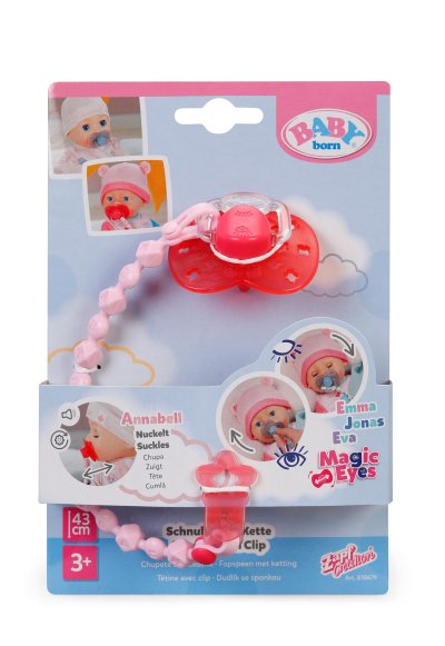 Kouzelný dudlík činí hru na rodiče ještě realističtější a interaktivnější! Díky speciální funkci panenky Annabell, Alexander, Emma, Eva, Jonas a Leah reagují na dudlík jako opravdová miminka. Zatímco Annabell a Alexander mají díky dudlíku sací reflexy, Emma, Eva a Jonas při otáčení dudlíku zavírají oči a klidně usínají. To dělá večerní uspávání zvlášť láskyplným a zajišťuje realistické hraní. Perfektní pro malé „rodiče“ panenek, kteří se chtějí starat o své panenky velikosti 43 cm. • Panenky reagují na dudlík • Annabell a Alexander sají dudlík • Emma, Eva a Jonas zavírají oči při otáčení dudlíku • Perfektní doplněk k hraní si s panekami • Vhodné pro funkční panenky velikosti 43 cm: kompatibilní s Emmou, Evou, Jonasem, Annabell, Alexandrem a Leah.