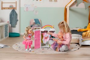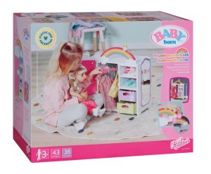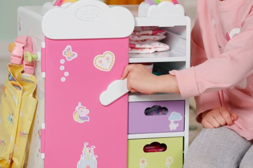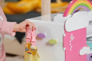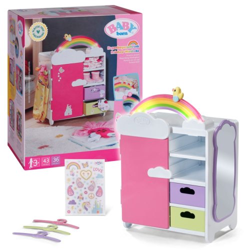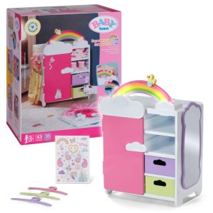 S duhovou šatní skříní BABY born je převlékání skvělá zábava! Když je kačenka Berta tlačena po duze, duha se rozsvítí. Berta hraje při vybírání outfitu veselou melodii, která jí dodává dobrou náladu. Díky šatní tyči, poličkám a zásuvkám je ve skříni dostatek místa na oblečení pro panenky. Kabelky nebo jiné věci na zavěšení lze pověsit na roztomilé háčky ve tvaru obláčků na vnější straně skříně. Kompletní outfit BABY born můžete obdivovat ve velkém zrcadle. Samotnou šatní skříň lze pomocí archu samolepek ještě více vyzdobit.