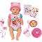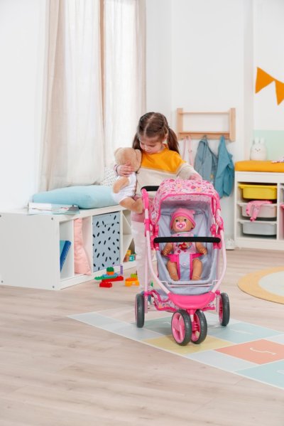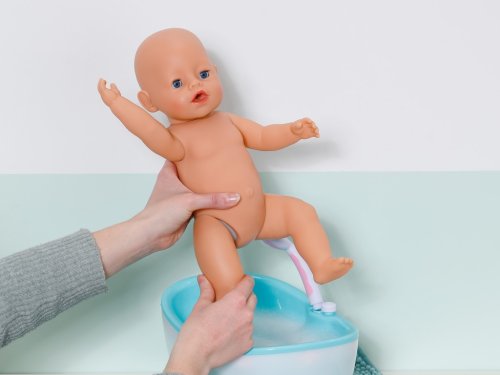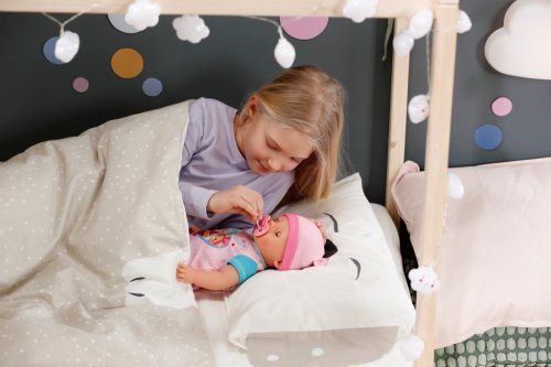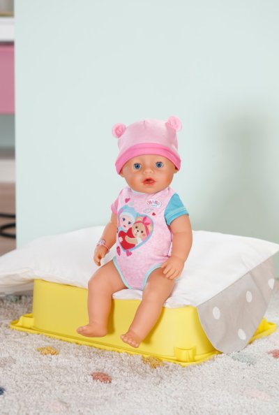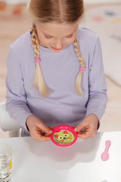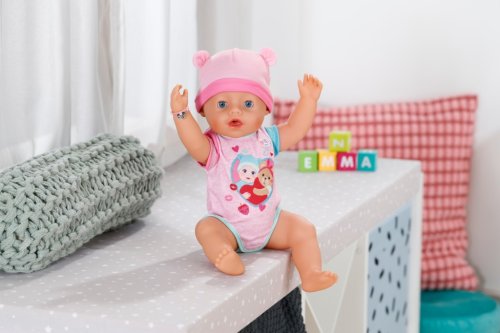 Představujeme Emmu! Panenku Emmu, známou z animovaného seriálu BABY born, na který se můžete podívat na našem kanále na Youtube, můžete mít nyní i doma. V novém oblečku a s 10 doplňky. Přináší si s sebou i kouzelný talířek: když do talířku s bílou destičkou uvnitř dáte trochu vody, objeví se na destičce lahodné jídlo s roztomilým obličejem, které z krmení panenky udělá ještě větší zábavu. Když Emmu po nakrmení (vodou) nebo po napití vody z lahvičky posadíte na nočník a zmáčknete jí bříško, objeví se na destičce v nočníku obrázek čůrání a kakání. Když se Emma napije vody z lahvičky, může ronit slzy a je třeba ji utišit. Pomoci může třeba kouzelný dudlík: když ho v pusince otočíte o 180 stupňů, očička se jí buď otevřou nebo zavřou. Otočte ještě jednou a stane se opak. Emma ale dokáže ještě víc: má pohyblivé klouby a můžete ji vzít i do vany. Nyní dokonce uschne rychleji, než kdy dříve: abyste panenku po hraní dobře vyčistili, je k tomu možné odejmout jednu nohu a vytvořit tím větší otvor pro čištění panenky. Voda tak z panenky snadněji odteče. Pro ještě zajímavější hru si Emma do svého nového domova kromě lahvičky, dudlíku, talířku s destičkou s obrázkem jídla a nočníku s destičkou s obrázkem čůrání a kakání přináší také plenku, rodný list, arch samolepek a dva náramky přátelství – jeden pro panenku a jeden pro její malou maminku – na důkaz dlouhého a láskyplného kamarádství mezi dítětem a panenkou. V kvalitě BABY born, která těší celé generace dětí už od roku 1991.
