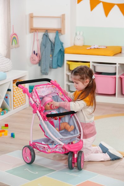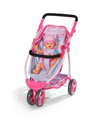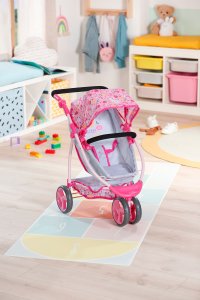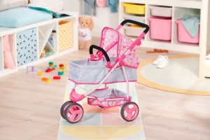 Kočárek pro panenky BABY born splní všechna přání: korbičku lze sklopit, a tak už BABY born neleží v klasickém kočárku, ale sedí ve sportovním kočárku a ze sedu sleduje svět kolem. Stříšku lze snadno sklopit, aby si BABY born mohla užívat sluníčka. V úložném prostoru je dostatek místa pro plyšového medvídka Teddyho, nákupy nebo poklady z procházky. Díky třem kolečkům je kočárek snadno ovladatelný. Výšku madla lze nastavit, mohou ho tak vozit různě velké děti. Po skončení procházky lze kočárek snadno složit a uložit, aby doma nezabíral tolik místa.