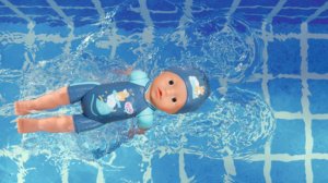 Panenka – chlapeček se sportovním duchem je jako opravdový malý delfín. V kurzu dětského plavání se hned naučil plavat kraula i motýlka. Když plave kraul, střídá ve vodě jednu ruku za druhou, u motýlka rukama hýbe nastejno. A to vše bez baterií! Stačí Plaváčkovi natáhnout ruce dozadu a je připraven na další závod. Když mu ruce uvolníš, začne ve vodě plavat. Nohy a hlava malého plavce jsou také pohyblivé, takže Plaváček může sedět na okraji bazénu a pozorovat třeba trénink skoků do vody.