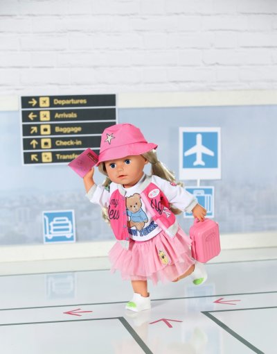 Tento outfit promění letiště v přehlídkové molo: cestovní oblečení BABY born skládající se z bundy, trička, tylové sukně, bot a čepice je dokonale sladěno.