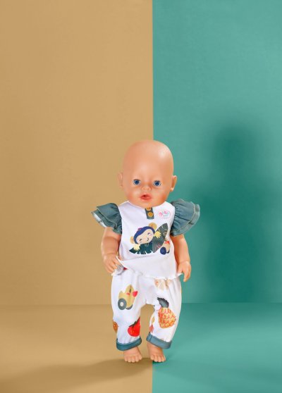 Z trička se zelenými volánkovými rukávy se na tebe usmívá roztomilá opička mezi dvěma banánovými listy. Kalhoty, které k tričku skvěle ladí, jsou potištěny obrázky různých druhů ovoce a kačenky Berty. • Sada trička a kalhot • Tričko i kalhoty jsou ozdobeny roztomilým potiskem opičky, kačenky Berty a ovoce • Tričko s knoflíky a volánkovými rukávy • Vhodné pro panenky velikosti 43 cm a pro medvídky BABY born Teddy • S ramínkem z recyklovaného materiálu • Kvalitní doplněk pro radost z nápadité, rozmanité a dlouhotrvající hry