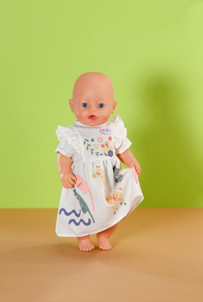 Volné, lehké a hravé! Tyto šaty inspirované safari jsou ozdobeny volánky na rukávech a obrázkem žirafy mezi dalšími motivy džungle. Jsou ideální pro slunečné dny. • Roztomilé letní šaty s volánkovými rukávy a s motivy džungle • Vhodné pro panenky velikosti 43 cm a pro medvídky BABY born Teddy • S ramínkem z recyklovaného materiálu • Kvalitní doplněk pro radost z nápadité, rozmanité a dlouhotrvající hry