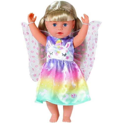 Víly a jednorožci k sobě patří stejně jako mléko a sušenky. Vílí šatičky pro panenku BABY born jsou ušity z nádherné duhové látky. Sukýnka je potištěna kouzelnými jednorožci tančícími po hvězdné obloze. Horní část šatiček je vepředu ozdobena obličejem jednorožce s našitými oušky a barevným rohem. Správná víla musí mít samozřejmě i křidélka. Průhledná křidélka s třpytivými kytičkami jsou všita do zadní části šatiček a jakmile BABY born prostrčí ruku malým očkem v horní části křidélek, otevřou se. Originální obleček pro panenky BABY born. Pro nápaditou, rozmanitou a dlouhotrvající hru. BABY born Pohádkový kostým Jednorožec pro panenky ve velikosti 43 cm. Součástí je ramínko.