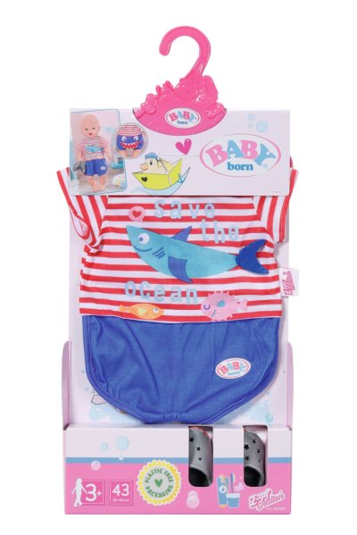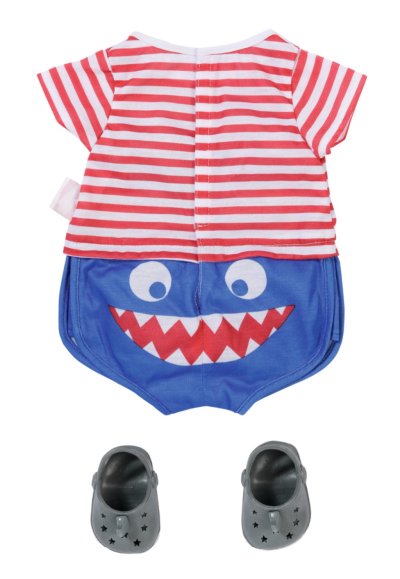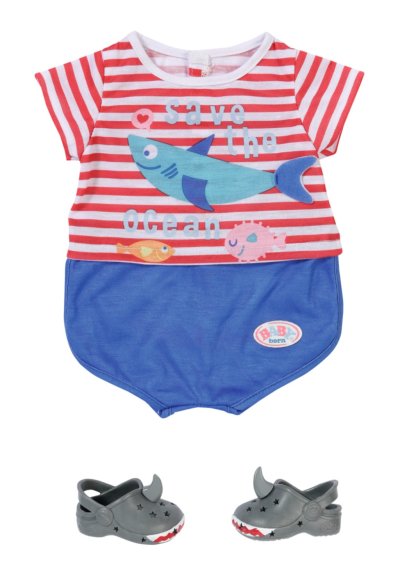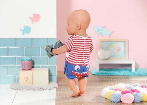 „Ahoj, BABY born! Už jsi připravená do postýlky?“ BABY born pyžamko vypadá jako námořnický oblek. Na horní části pyžamka jsou červené a bílé proužky. Plavou na nich malé rybičky a přátelský žralok. Námořnicky modré kalhotky perfektně zakryjí zadeček s plenkami. Aby zůstaly nožičky BABY born hezky v teple i když stojí na koupelnových dlaždicích, nosí šedé bačkůrky s ploutvičkou a ozdobou žraločích zubů.