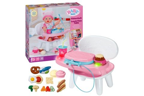 Tak co, chutná Ti? BABY born díky své nové jídelní židličce objevuje nejrůznější jídla. Ale všechny ráda nemá. Co takhle nějakou zeleninu? Světelné a zvukové efekty naznačují, zda BABY born chutná nebo ne. Když se políčko s dezertem nebo nápojem rozsvítí zeleně, BABY born spokojeně jí a netrpělivě čeká na další lžičku. Ale když se rozsvítí červeně, BABY born protestuje hlasitým Bahhh!. Dokáže ji snad lžička se zvuky letadla přesvědčit, aby zkusila něco jiného? Výběr je více než bohatý: okurka, sázené vejce, špagety, muffiny a spousta dalších jídel, dezertů a nápojů. Na zbytky je tu malá svačinová krabička – nic nepřijde nazmar. Rozměry ablení 34x35x13 cm. Napájení na 3xAAA baterie - nejsou součástí balení. Věk 3+