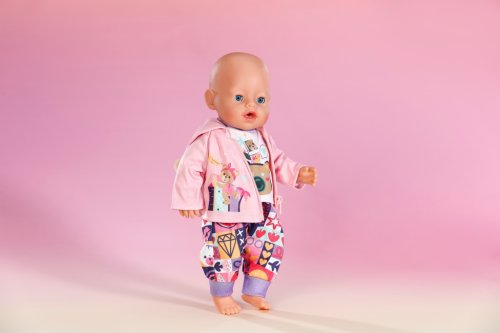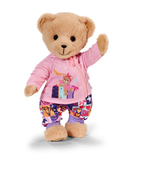 Roztomilý outfit udrží miminko pěkně v teple díky kalhotám s patchworkovým vzorem, světle fialovému tričku s dlouhým rukávem a praktické růžové mikině s kapucí. Obleček pro miminko skládající se z kalhot, trička a bundy. Kalhoty s barevným patchworkovým vzorem. Tričko s dlouhým rukávem ve světle fialové barvě s motivem medvídka. Bunda s kapucí, zipem a ušima medvídka. Velikost 43 cm. Věk 3+