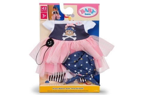 S pirátským dívčím outfitem BABY born začíná velké dobrodružství. Souprava šatiček, kalhot, šátku na hlavu a pásky přes oko umožní dětem ponořit se do světa pirátů. Ať už při hledání pokladů nebo na otevřeném moři, je BABY born skvěle vybavena. Outfit se snadno obléká a zaujme roztomilými detaily. Pro příběhy plné fantazie, odvahy a přátelství. Vhodné pro panenky velikosti 43 cm i pro BABY born medvídky. Věk 3+