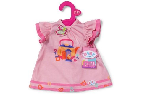Šatičky BABY born s motivem čajové konvičky zvou k hravým odpoledním dýchánkům. Pozvání určitě rády přijmou panenky i kamarádi. Pohodlný střih umožňuje snadné oblékání a svlékání a podporuje samostatnost malých „rodičů panenek“. Vhodné pro panenky velikosti 43 cm i pro medvídka BABY born. Věk 3+