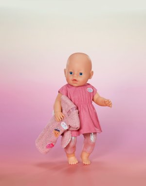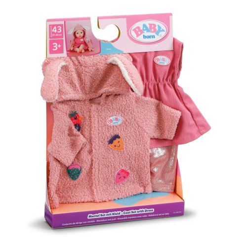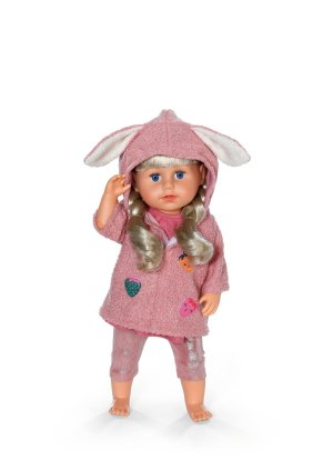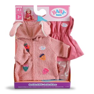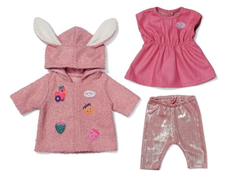 Souprava s kabátkem promění BABY born v roztomilého zajíčka. Plyšový kabátek s oušky na kapuci a jahodovými detaily zahřeje v chladnějších dnech. Pod ním se skrývají šatičky a legíny. Prostě ideální outfit pro každé roční období. Věk 3+
