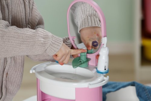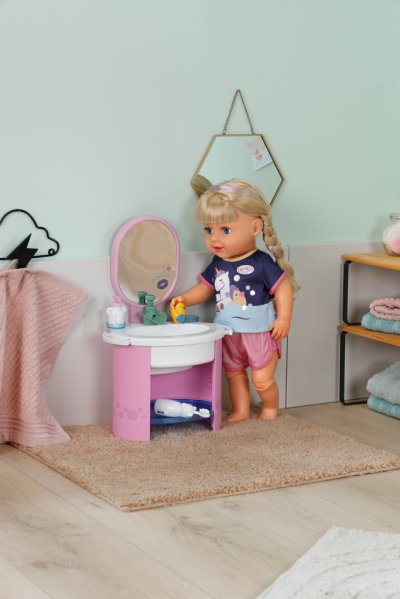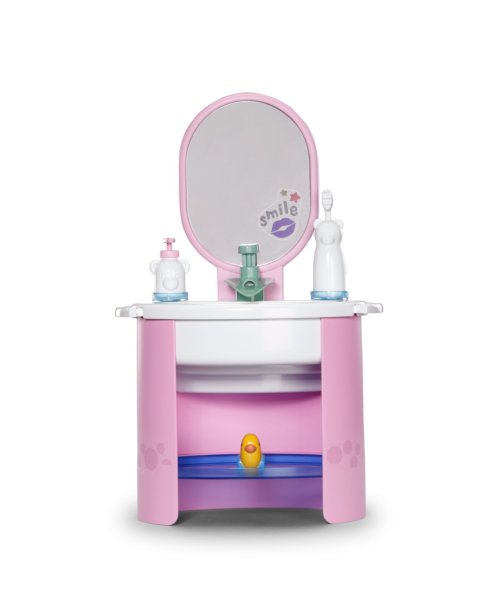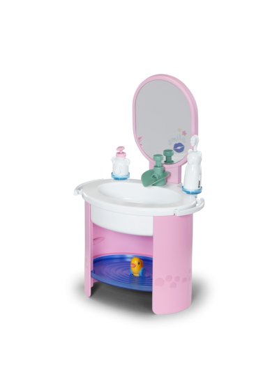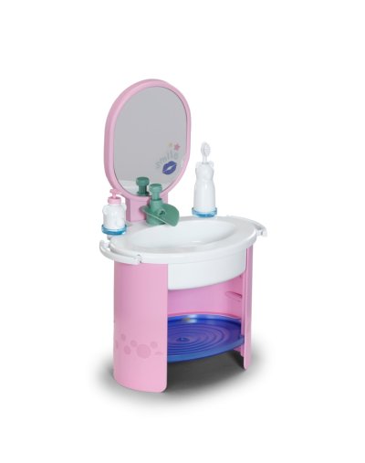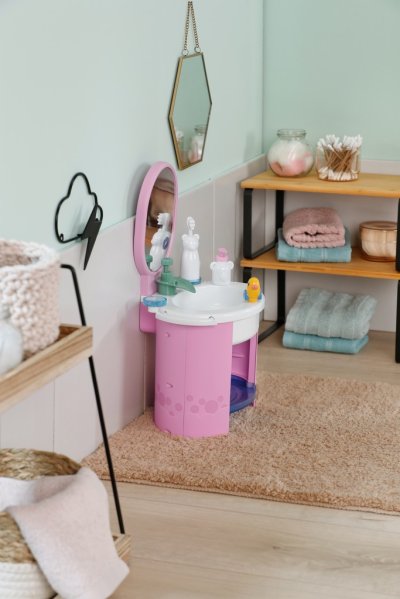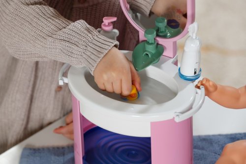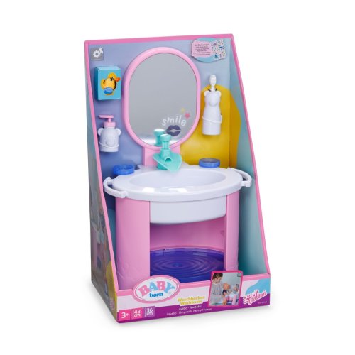 S umyvadlem BABY born se mytí rukou a čištění zubů stává skvělou zábavou. Umyvadlo je vybaveno vším, co malí rodiče panenek potřebují pro hygienu, a přináší do dětského pokoje realistickou herní zábavu. Díky čistě mechanickému vodnímu čerpadlu může z kohoutku téct skutečná voda. Malý zubní kartáček, který vibruje stejně jako elektrický kartáček, nevyžaduje žádné baterie. Samozřejmě nesmí chybět ani dávkovač mýdla. Arch samolepek umožňuje individuální ozdobení umyvadla a doplňků. Mytí rukou se tak stává skutečnou zábavou. Rozměry balení 25x41x18 cm. Věk 3+