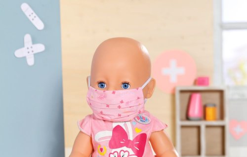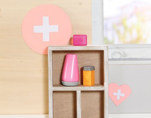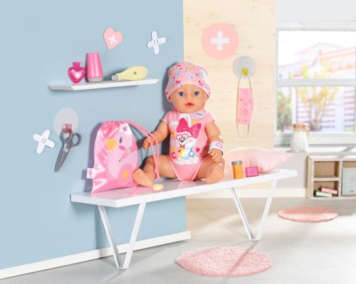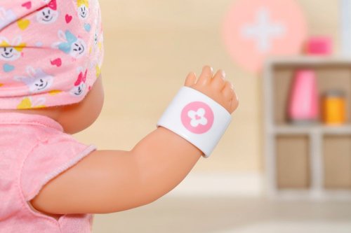 „Au, to bolí!“ Ajéje, po tvářích BABY born se koulí slzy jako hrachy. Zakopla totiž o školkový batůžek své malé sestřičky. Ta malá uličnice vždycky nechává své věci ležet uprostřed předsíně. Bratříček rychle utíká pro sadu s první pomocí. Zcela profesionálně jako opravdový záchranář si hned nasazuje růžovou roušku. Pak z tašky vytáhne vše, co potřebuje k ošetření rozbitého kolene panenky BABY born. Tubu s mastí a obvaz, který nůžkami ještě trochu upraví. Jakmile BABY born spatří krabičku s léky a lžičku s medicínou, vykulí oči. Léky ale zatím naštěstí nepotřebuje. Bratříček záchranář chce raději ještě změřit teplotu. Malá kaskadérka ji má z rozrušení trochu zvýšenou. Třeba by se ohřívací láhev mohla změnit na chladicí polštářek. Poté bratříček všech 9 zdravotních pomůcek schová zpět do látkového sáčku, který zdobí obrázek zdravotní kačenky Berty.