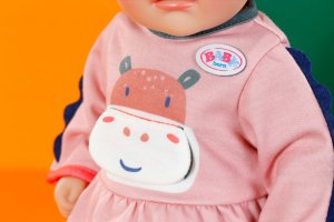 Vítejte v džungli! Hrošík na šatech dětem okamžitě zvedne náladu. Roztomilé detaily na rukávech spolu s modrými pruhovanými legínami perfektně doplňují celý outfit. A to není vše: Hrošík dokonce může otevřít pusu a má pro vás sladkou zprávu! • Sada šatiček s motivem hrošíka a pruhovaných legín • S interaktivním prvkem - otevíratelná pusa hrošíka • Vhodné pro panenky velikosti 36 cm • Součástí je ramínko z recyklovaného materiálu • Kvalitní doplněk pro rozšíření kreativní a pestré hry