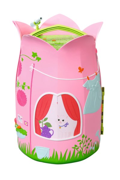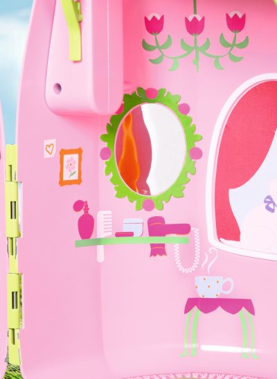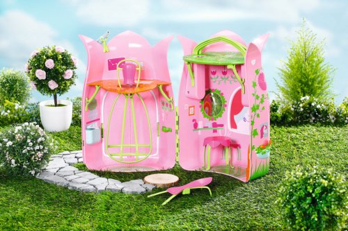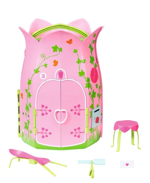 Domeček pro všechny obyvatele pohádkového světa Storybook. Otevřením domečku ve tvaru květiny se odhalí nádherný domov pro víly, který je plný nápadů na hraní a různých doplňků. Obývací pokoj je vybaven stolečkem a krbem. Ze stropu herny visí houpačka. Přihrádka na stěně je skvělým místem pro uložení kouzelné hůlky, třeba když se víla houpe na houpačce. Když se někdo na houpačce zasněně houpe tam a zpět, slyší to celý pohádkový svět. Při houpání totiž zvoní květinový zvonek připevněný k horní části houpačky. Na zábradlí první střešní terasy lze připevnit dalekohled. Je to skvělé místo na sledování nových příběhů a vyhlížení kouzelných kamarádů. Po celodenním dobrodružství můžou obyvatelé pohádkového světa odpočívat na lehátku v druhé části terasy. Rukojeť ve tvaru obří trávy poskytuje dostatek stínu. Zároveň lze díky praktické rukojeti uzavřený domeček jednoduše přenášet.