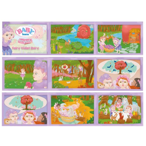 BABY born Storybook Fialková víla je panenka velikosti 18 cm. Součástí je kouzelná hůlka, pódium, kulisy a obrázková knížka.