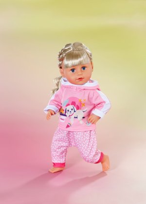 BABY born růžová teplákovka s mikinou a kalhotami pro panenky velikosti 43 cm. • Roztomilá teplákovka: Sada mikiny a kalhot. • Udržitelnost: Součástí je ramínko z recyklovaného materiálu. • Vhodné pro panenky velikosti 43 cm a pro medvídky BABY born Teddy. • Kvalitní doplněk pro radost z nápadité, rozmanité a dlouhotrvající hry.