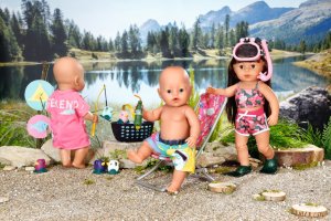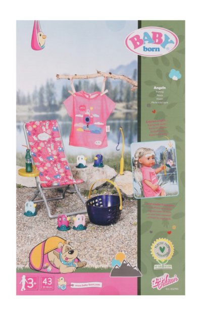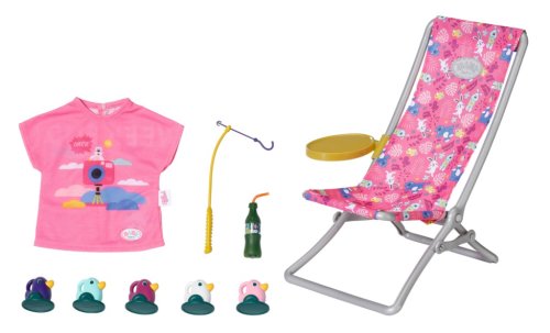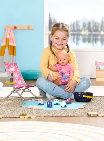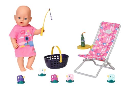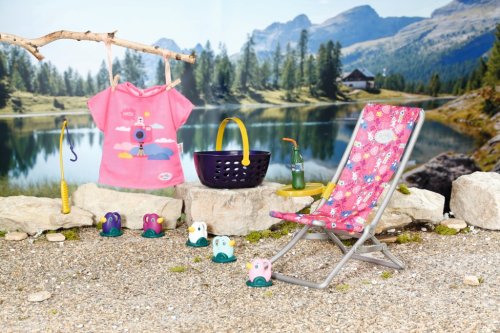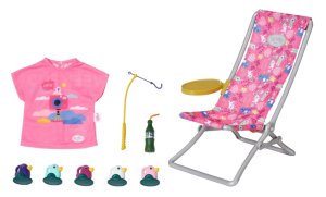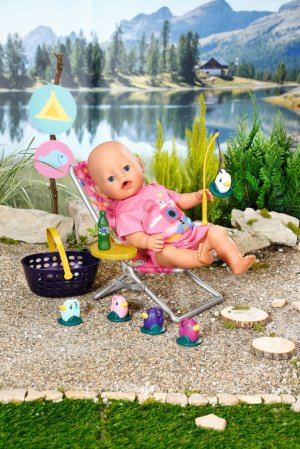 BABY born Víkendová souprava na rybaření obsahuje obleček, lehátko se stolkem, láhev s limonádou, košík, 5 kačenek a rybářský prut.