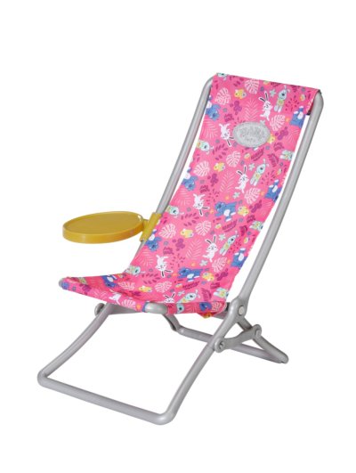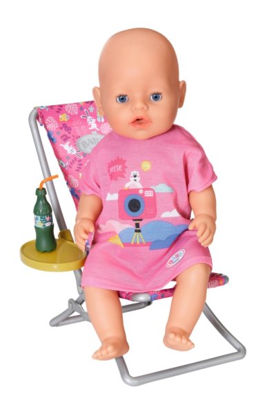 „V moři je ryb mnohem víc…“ Ale BABY born raději chytá roztomilá káčátka. Zatímco pohodlně sedí v růžovém lehátku s barevným vzorem, snaží se na háček udičky chytit jednu z pěti kačenek. Tu a tam si usrkne limonádu, kterou má položenou na žlutém stolku u lehátka. Když vyloví všechny kačenky a má je uloženy v modrém koši, vrátí je zpátky do rybníka a zábavná hra může začít znovu. Na tuto hru na rybaření si BABY born oblékla ležérní dlouhé růžové tričko s roztomilým potiskem.