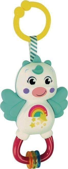 Barevné chrastítko v podobě malého jednorožce s měkkými a bezpečnými gumovými prvky. praktické poutko na zavěšení křidýlka slouží jako kousátko tři malé měkké kroužky stimuluje smyslové vnímání
