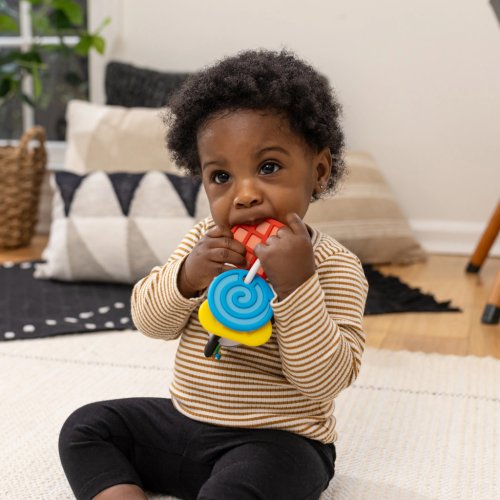 Zapojte dětské smysly a zklidněte bolavé dásně pomocí kousátka Baby Einstein Shake-a-Shape. Toto kousátko a chrastítko 2v1 bez obsahu BPA zapojuje dětské prstíky, očka a ouška, aby děťátko zabavilo, zapojilo smysly a představilo barvy, tvary a dovednosti týkající se příčin a následků. Při třesení Zenem, bude miminko slyšet chrastící zvuky, může tak zkoumat Zenovy uši s texturou, cítit barevné senzorické provazy a usmívat se, když vidí svůj odraz v zrcadle na zadní straně. Tři silikonové tvary pomáhají uklidnit bolavé dásně a rodiče je mohou použít k výuce barev a tvarů. Navrženo tak, aby se daly děťátku snadno uchopit.