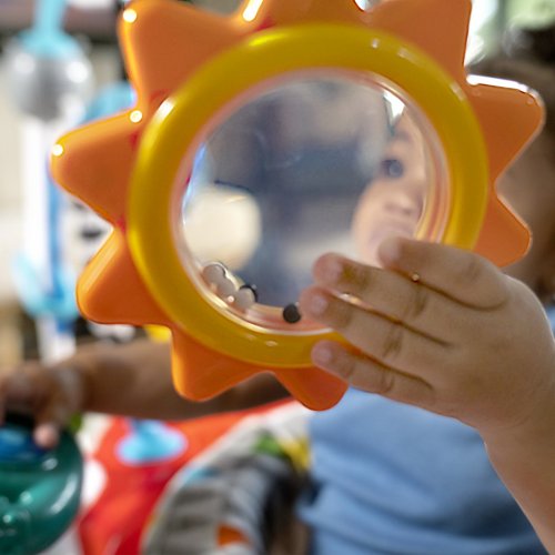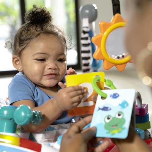 Děťátko při každém odrazu aktivuje písničky a světla, aby se dostalo do smyslově stimulujícího vzletu. Odnímatelný elektronický hrací pultík obsahuje 10 interaktivních komponent včetně 7 tlačítek, plynu a volantu, které pomáhají dítěti pilotovat. Dítě se může učit tvary, barvy a čísla ve 4 jazycích - angličtině, španělštině, francouzštině a němčině. 7 multisenzorických hraček a aktivit zapojuje vývojové dovednosti, jako jsou příčina a následek a dovednost. Oblíbené postavičky Baby Einstein Ocean Explorers, jako Cal, Zen a Neptun, slouží dítěti jako kopiloti.