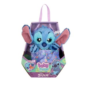Baby Paws – plyšové štěňátko Stitch je interaktivní plyšová hračka inspirovaná postavičkou Stitche z filmu Lilo & Stitch. Tento roztomilý kamarád je vyroben z měkkého a huňatého plyše v typických modrých odstínech, které věrně odpovídají originálnímu vzhledu postavičky. Stitch má velké uši s růžovým vnitřkem, které jsou výrazným prvkem jeho designu, a jeho oči jsou navrženy tak, aby působily přítulně a živě. Plyšák sedí a má na krku zavěšený růžový dudlík, který slouží jako doplněk a pomáhá mu „usnout“.