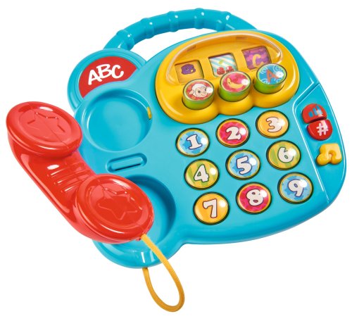 Barevný baby telefon se sluchátkem vydává různé zvuky a po stisknutí tlačítka se na "displeji" točením změní náhodně obrázek. 3 tlačítka pro změnu písmena, ovoce a zvířátek. Zvuk při stisku jednotlivých číslic, zvuk vytáčení tel. čísla, hraje i několik melodií. Rozměry: 20 x 20 cm.