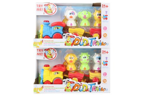 Plastový baby vláček se zvířátky. Vláček jezdí, houká, hraje, zvířátka se pohybují (když vláček jede), při zmáčknutí jednoho ze zvířátek můžete změnit rychlost jízdy vláčku. Napájení na 3 AAA baterie (jsou součástí). Rozměry vláčku cca 29 x 10,5 x 7 cm. Rozměry balení cca 33 x 20 x 8,5 cm. Věk 24m+