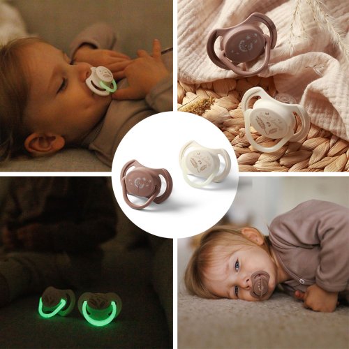 Symetrická silikonová savička zklidní vaše miminko a dopřeje vám chvilku odpočinku. Zploštělá špička po obou stranách se dokonale přizpůsobí ústům dítěte a podporuje správný vývoj chrupu a polohu jazyka. Profilovaný štítek s otvory umožňuje volné dýchání nosem a zajišťuje cirkulaci vzduchu kolem úst. Náustek je vyroben z hypoalergenního, bezpečného silikonu, který je odolný vůči poškození a neobsahuje BPA. Souprava obsahuje 2 dudlíky pro děti ve věku 18+ měsíců – jeden pro denní použití a jeden se svítící rukojetí, ideální pro noční zklidnění.