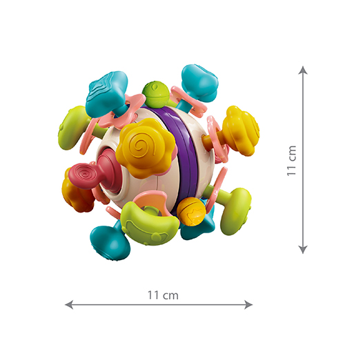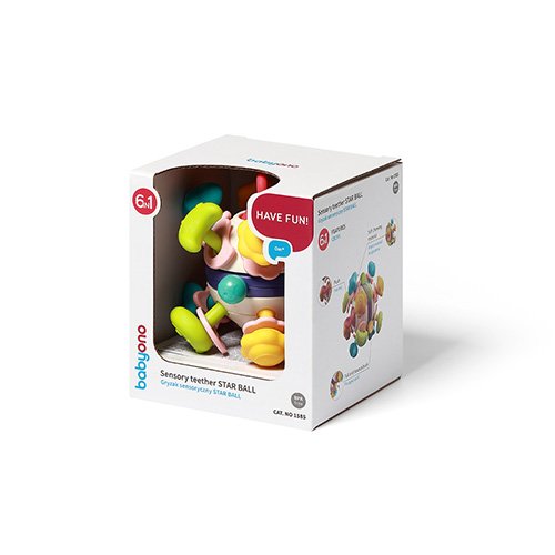 Hračka senzorická s kousátkem Star ball je perfektní hračkou pro vaše děťátko. Celá je vyrobena z bezpečných materiálů a zároveň má promyšlený design, který podporuje dětské senzorické a motorické dovednosti. Materiál příjemný na dotek a bezpečný silikon jemně stimulují dětské dásně čímž pomáhá při období prořezávání zoubků. Rotační kroužek, který je integrován do hračky, nejen přitahuje pozornost, ale vydává i jemné zvuky, které stimulují sluch dítěte.