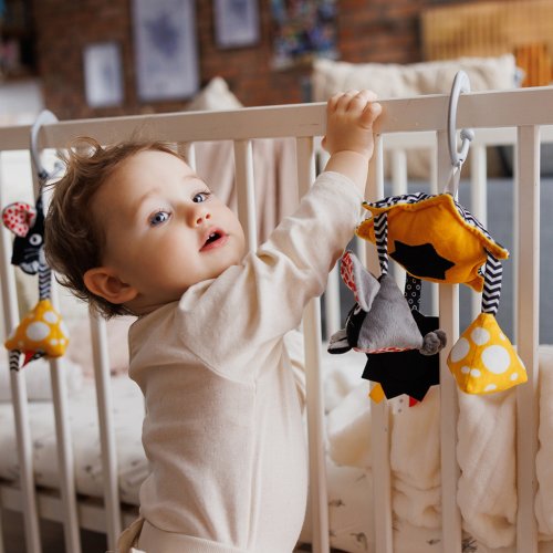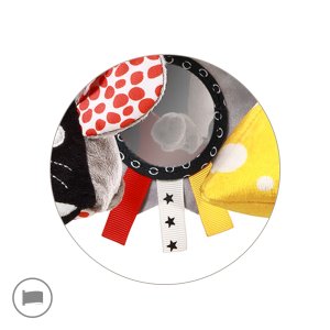 Kontrastní závěsná hračka na kočárek je senzorickou hračkou plnou překvapení! Hra si s touto veselou myškou podněcuje fantazii, stimuluje smysly a podporuje motorický vývoj vašeho dítěte. Obsahuje dvě chrastítka a šustivé zvuky pro stimulaci sluchu, barevné visačky a kudrnatý ocásek pro podporu uchopení a bezpečné zrcátko pro zkoumání vlastního odrazu. Vytvořili jsme ji v kontrastních barvách a s geometrickými vzory, které pomáhají rozvíjet zrak od prvních měsíců života. Tuto závěsnou hračku můžete připevnit na kočárek a autosedačku, což zajistí zábavu na procházkách a výletech.