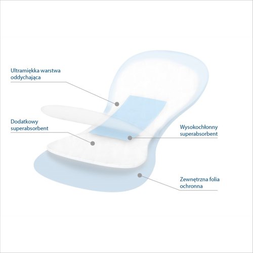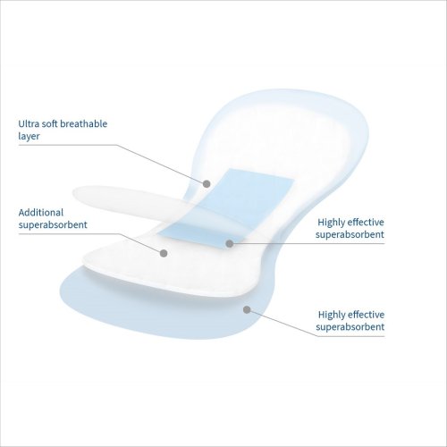 Vložka se skládá ze 4 vrstev. Prodyšná a ultra měkká vnitřní vrstva umožňuje cirkulaci vzduchu a dodává pocit svěžesti. Dvě super absorpční vrstvy dvojnásobně vážou vlhkost, zajišťují zadržování tekutin uvnitř vložky a neutralizují nepříjemný zápach. Vnější vrstva fólie zabraňuje úniku a chrání spodní prádlo před nečistotami.