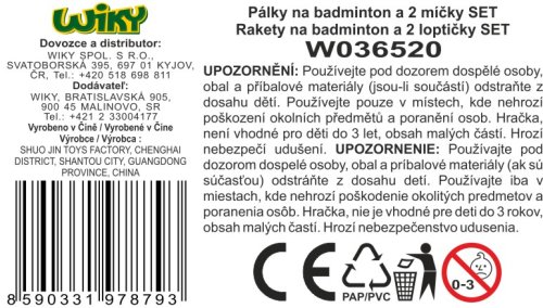 Badminton set. Délka 65 cm. Obsah balení - 2 rakety, 2 pěnové míčky. 3 varianty - modrá, červená, žlutá.