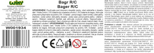 pohyb dopředu (obě páčky dopředu) pohyb dozadu (obě páčky dozadu) pohyb levé nebo pravé páčky (otáčení) přední levé tlačítko - demo funkce přední levé tlačítko - nabírání 4 tlačítka uprostřed - zvukové frekvence 2.4GHz bagr - baterie 4xAA (nejsou součástí) ovladač - baterie 2xAA (nejsou součástí) světelné a zvukové efekty Velikost: 32 cm