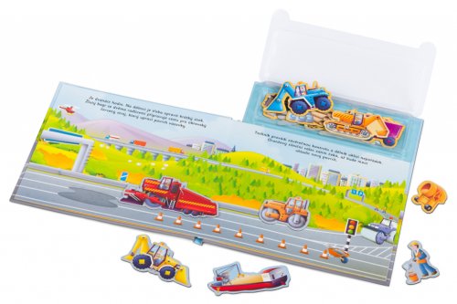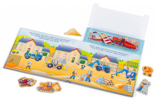 Čteme a hrajeme si s magnetkamiBagry jsou vždy připraveny pomáhat – stavět a opravovat. V lomu, na dálnici, na stavbě, ale třeba taky na pláži – tam všude najdeme nejrůznější stavební stroje. Tam všude nám pomáhají. Na každé stránce téhle knížky objeví děti kratičký příběh, který mohou spoluvytvářet pomocí magnetek. A až si do sytosti vyhrají, mohou všechny stroje zase „zaparkovat“ zpátky do úložného boxu, kde budou připraveny na další skvělou zábavu.
