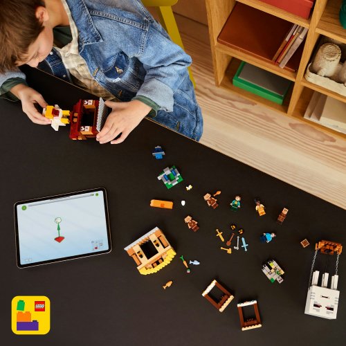 Stavebnice obsahuje oblíbené postavy z videohry: Steva, Natalii, Dawn, 2 pigliny, balón v podobě ďasa, vesničana, kuře a pohyblivou figurku železného golema. V balónu je prostor pro pigliny a obsahuje vystřelovač disků. Ve vesnici najdete stánky z trhu, Steveovu restaurace se smaženým kuřecím masem, jeho chata na tvoření a fontána, kterou děti „vyhodí do povětří“ pomocí vestavěného prvku. Střechu restaurace zdobí velký model slepice se zábavnou funkci snášení vajec. Děti si užijí porci digitální zábavy s aplikací LEGO Builder, která jim umožňuje přibližovat modely, otáčet je ve 3D a sledovat postup při stavění.