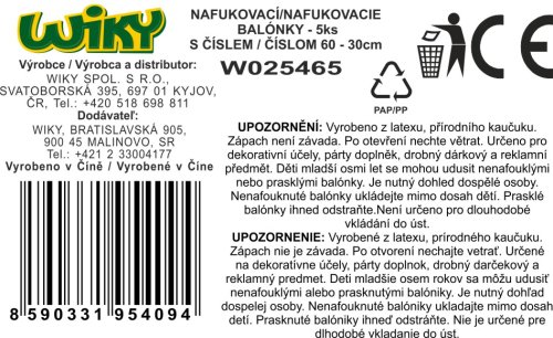 Balónek nafukovací 30 cm - sada 5ks, s číslem 60