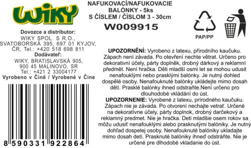 Balónek nafukovací 30cm - sada 5ks, s číslem 3