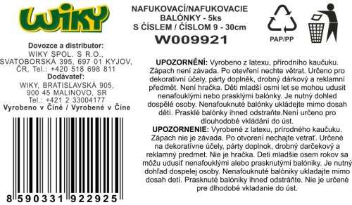 Balónek nafukovací 30cm - sada 5ks, s číslem 9