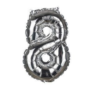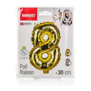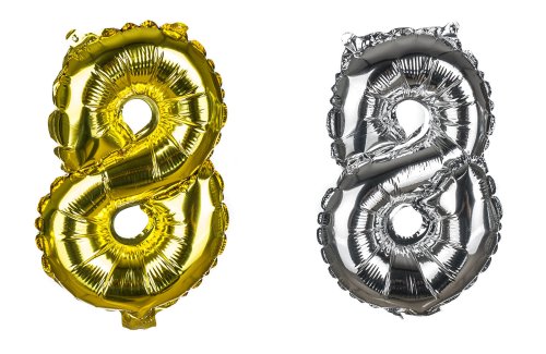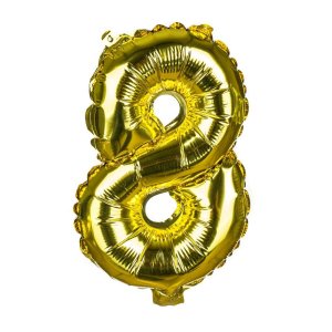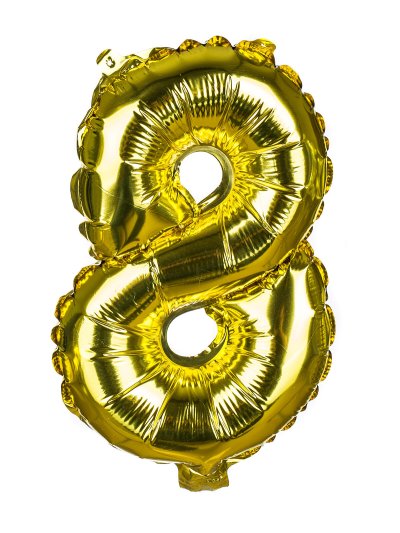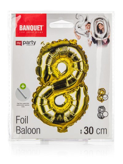 Balónek nafukovací fóliový číslo 8, je vysoký cca 30 cm, barevný mix: zlatá a stříbrná barva. Součástí výrobku je papírové brčko pro nafouknutí balónku a šňůrka pro zavěšení. Výrobek využijete na oslavě, zahradní párty, pikniku apod.