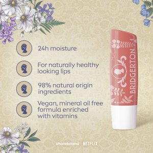 Limitovaná edice inspirovaná romantickým světem Bridgerton. Dodává rtům jemnou barvu, přirozený lesk a zároveň intenzivní hydrataci. Díky vůni šťavnatých broskví a pečujícímu složení zanechává rty hebké, vyživené a neodolatelně zářivé.