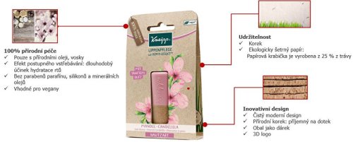 Přírodní péče pro citlivé rty s jemnou vůní mandlových květů. Balzám obsahuje výživný kandelilový vosk a vysoce kvalitní mandlový olej, který podporuje regeneraci pokožky, vyživuje pokožku a uzamyká v ní hydrataci. Je vhodný pro velmi citlivou a dětskou pokožku. Kandelilový vosk má ochranné, regenerační a hydratační účinky.