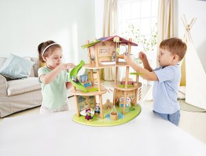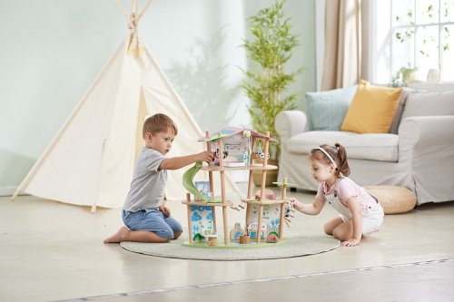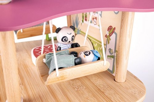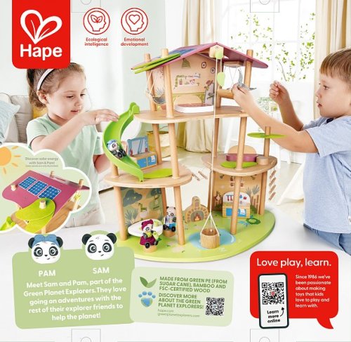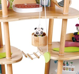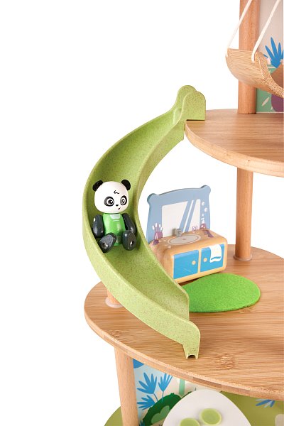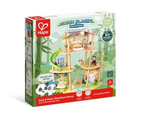 Bambusový domeček pro pandy. Tato sada z kolekce Green Planet Explorers je vyrobena z udržitelného bambusu a nabízí spoustu herních prvků – najdete v ní krb, houpací sítě, provazový žebřík, a dokonce i výtah. Společně s rodinkou čtyř pand strávíte nekonečné hodiny objevováním světa plného dobrodružství – a zároveň se zábavnou formou naučíte něco o udržitelnosti, když budete s pandí rodinou prozkoumávat divokou přírodu. Hračka podporuje rozvoj jemné motoriky, fantazie, kreativity, sociálních dovedností, a především znalostí o principech udržitelnosti. Sada obsahuje: domeček, čtyři figurky pandy, dvě houpací sítě, postel, toaletní stolek, pohovku, čajový stolek, dvě podlahové rohože, slunečník, stůl se dvěma pařezovými sedáky, krb, kamna, dva talíře, dva šálky, pánev, výtahový koš na provázku, visutý most, skluzavku a provazový žebřík. Domeček a postavy jsou vyrobeny z udržitelných materiálů, včetně bambusu, zeleného PE plastu a dřeva s certifikací FSC. Rozměry domečku: 61,2 x 59,4 x 34 cm. Rozměry balení: 60 x 61 x 10 cm. Věk: 4+
